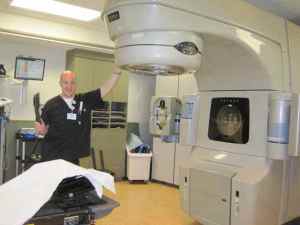 This is the giant machine which I never really noticed until today when they had me wait in the room instead of in the hallway. The large round thing in front comes down like an arm over me when I lie on the table. It only takes a few minutes from each side. They spread out the sessions so that the healthy tissue does not get injured but I never realized where the machinery came from until today.